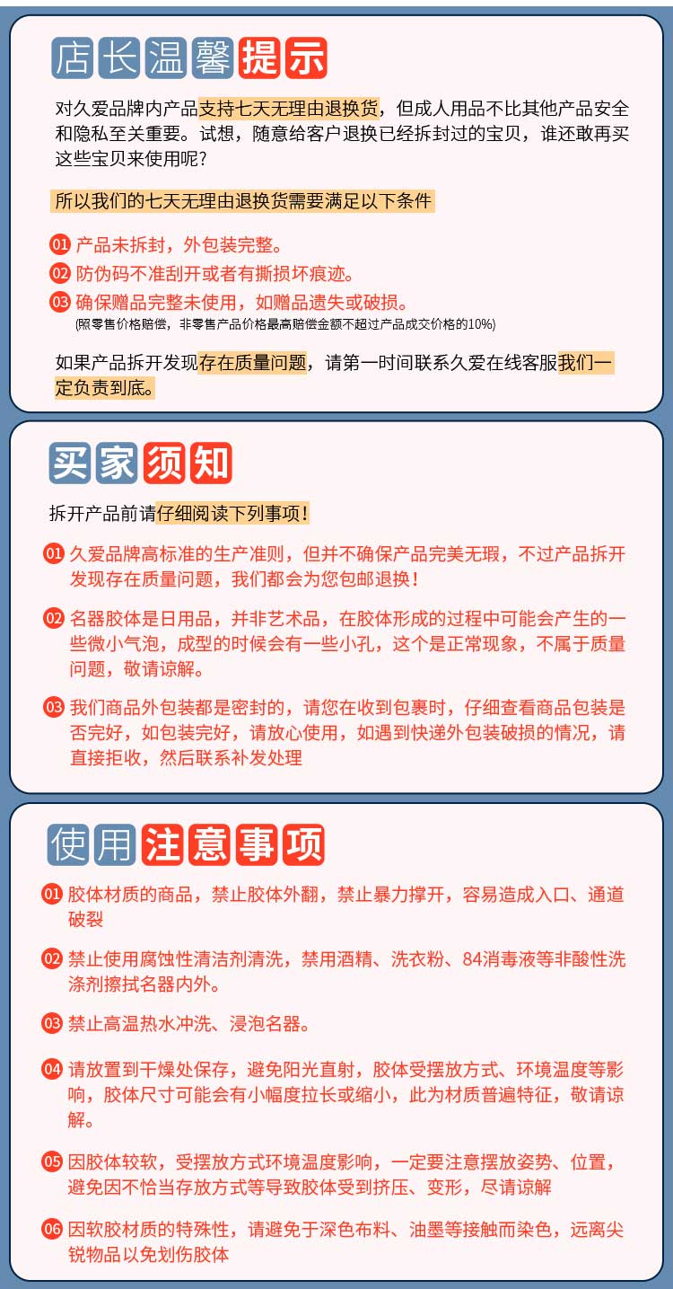 因为专注,所以信赖!先验货后签收,付款方式多样化,七天无理由退货,退货免运费,15天内包换货,换货运费自理。7*15小时超长时间服务。凭借独一无二的专注和前所未有的偏执,为您打造最值得信赖的情趣正品售后服务体验。